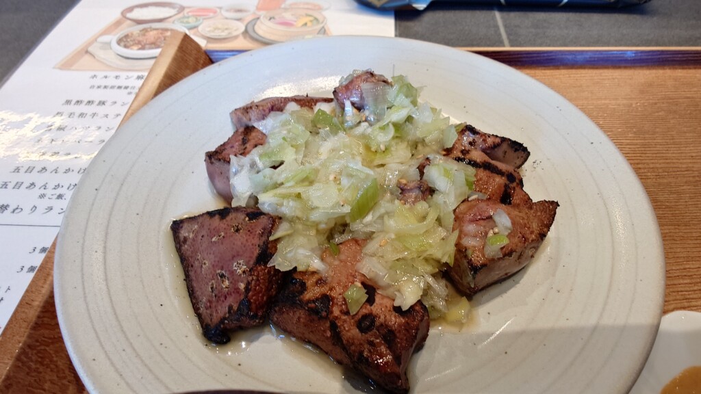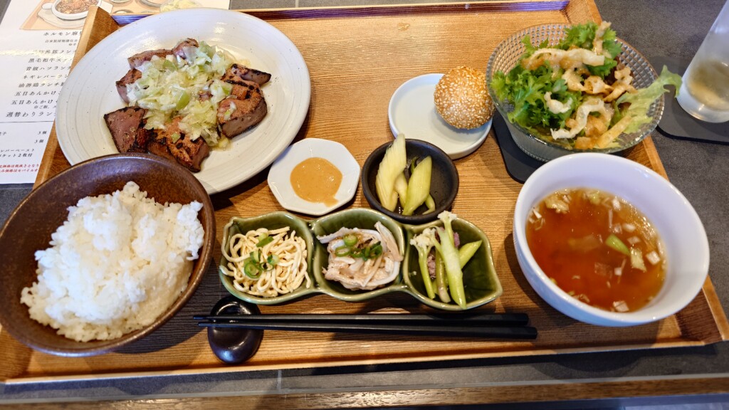 「ホルモン×中華 小皿料理KAZU家」で頂く、ネギレバーランチ膳となります