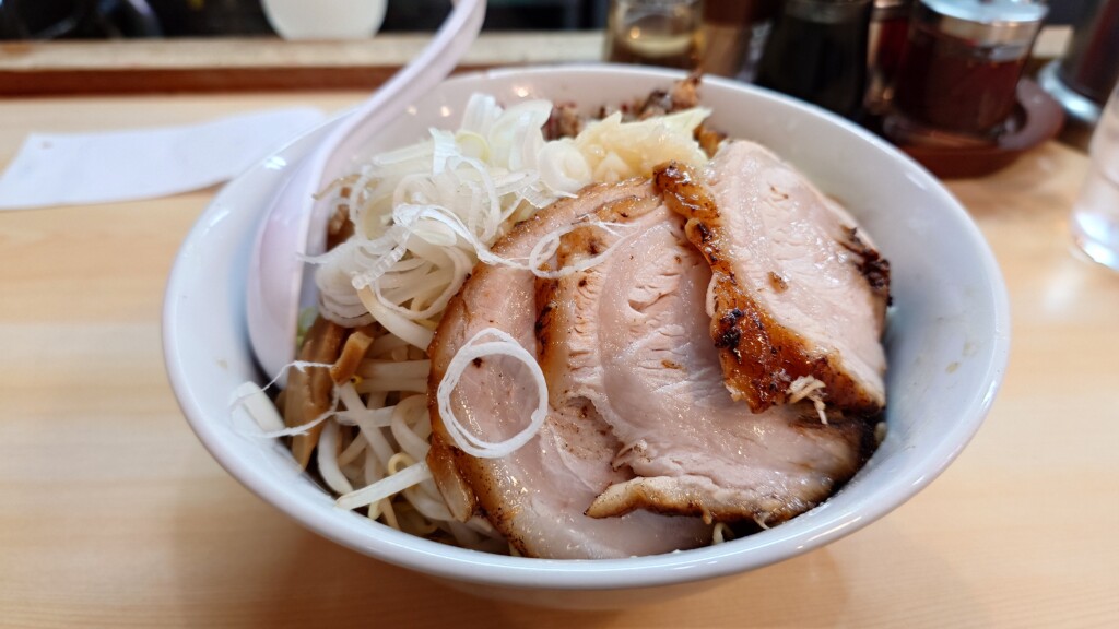 分厚めのチャーシューにたっぷりもやし、おろしニンニクらを添えた同品