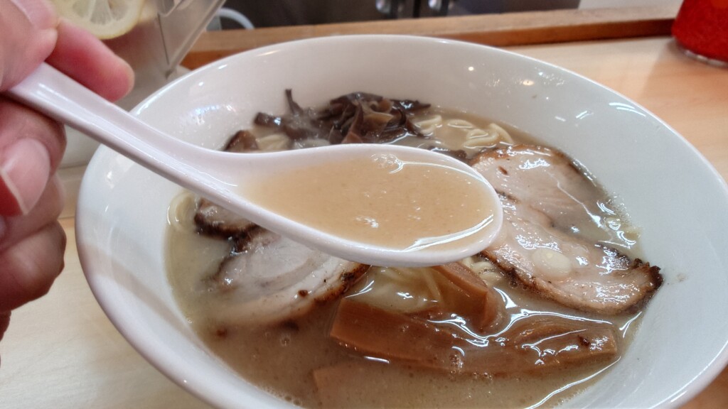 白濁した中に甘みを残す、とろりとした舌触りの豚骨スープ